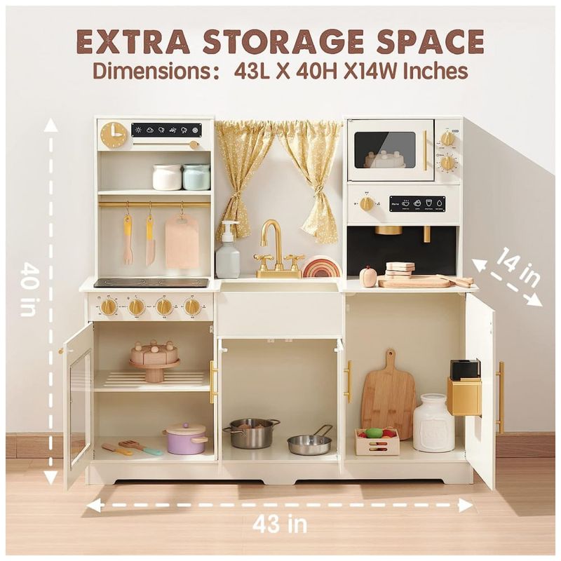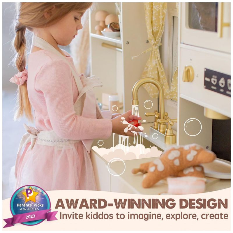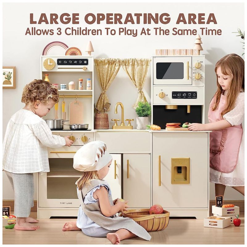 Área operacional maior a cozinha de recreação atualizada permite que três crianças brinquem ao mesmo tempo. As crianças podem cortar ingredientes, organizar ingredientes ou colocar outros acessórios de cozinha de brinquedo na superfície de trabalho. As dimensões da cozinha de brinquedo são 109 x 101 x 35 centímetros e a altura da bancada é de 55 centímetros.