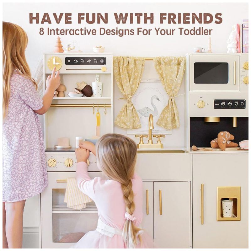 Muitas características do jogo A cozinha de madeira está equipada com uma máquina de fazer gelo, cafeteira, micro ondas, fogão, torneira e pia. Ele também vem com um relógio, mesa de tempo, forno e armários. Uma configuração rica pode melhorar a coordenação e a imaginação das crianças.