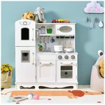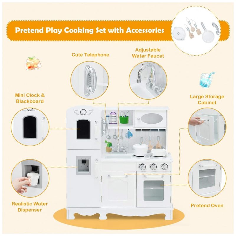 APARÊNCIA REALISTA A cozinha realista para crianças brincam proporcionará ao seu filho uma experiência de culinária autêntica, que apresenta fogão, pia, geladeira, relógio e botões com som. O dispensador de água é projetado com efeitos de luz e som, que simulam realisticamente a água de vazamento. Além disso, este conjunto de brinquedos de cozinha pode evitar os perigos de cozinhas reais.