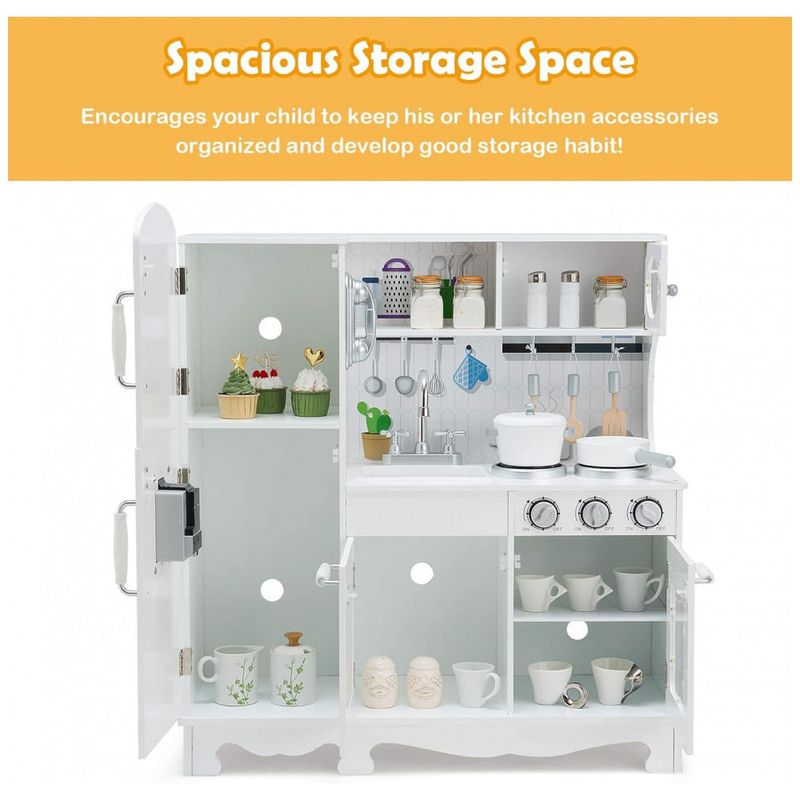 QUADRO MATERIAL E ESTÁVEL Para garantir sua segurança, o MDF e o PP selecionados passaram na certificação ASTM, de modo que o brinquedo de comida de cozinha fingido para esse garoto é absolutamente de usar. Comparado com uma cozinha infantil de plástico, este conjunto de brinquedos de cozinha apresenta uma estrutura mais estável e fornece um serviço mais longo.