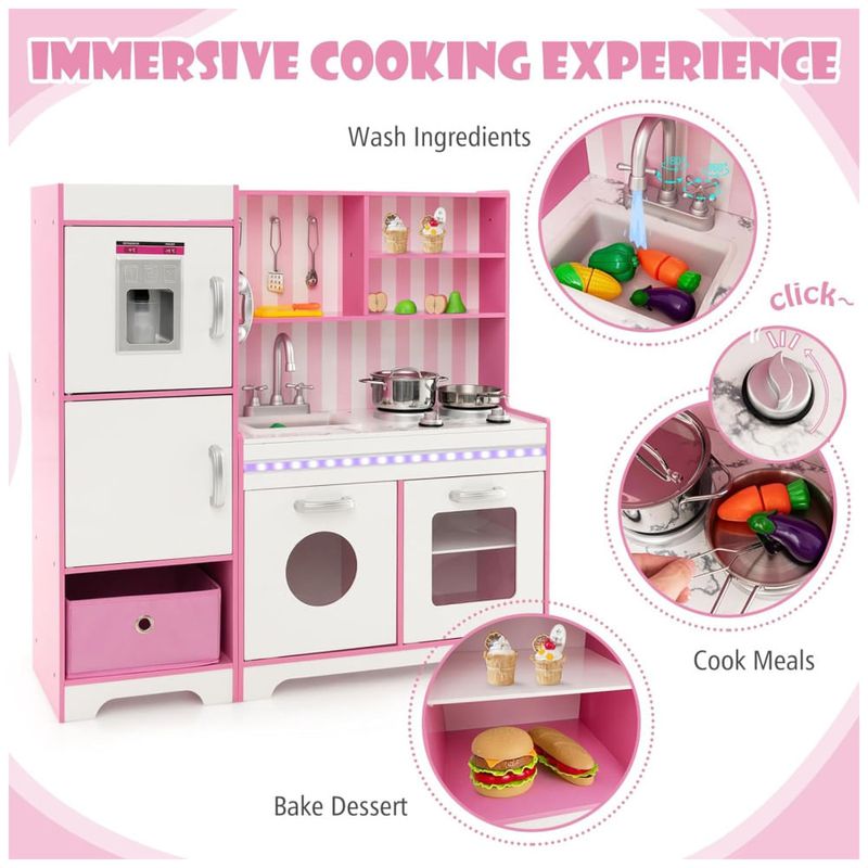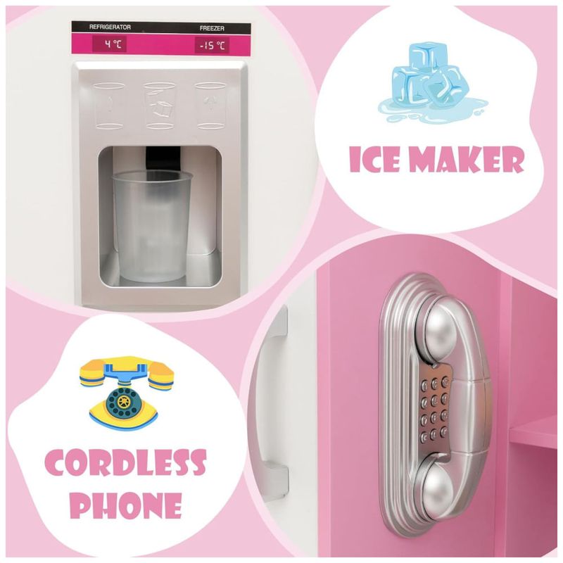 A cozinha infantil imita uma cozinha real com máquina de fazer gelo, telefone, fogão, pia e forno, além de botões rotativos que emitem sons de clique para maior diversão. O conjunto possui uma grande capacidade de armazenamento com várias áreas de armazenamento abertas e fechadas, incluindo um compartimento de tecido removível e uma prateleira para aumentar a flexibilidade de armazenamento.