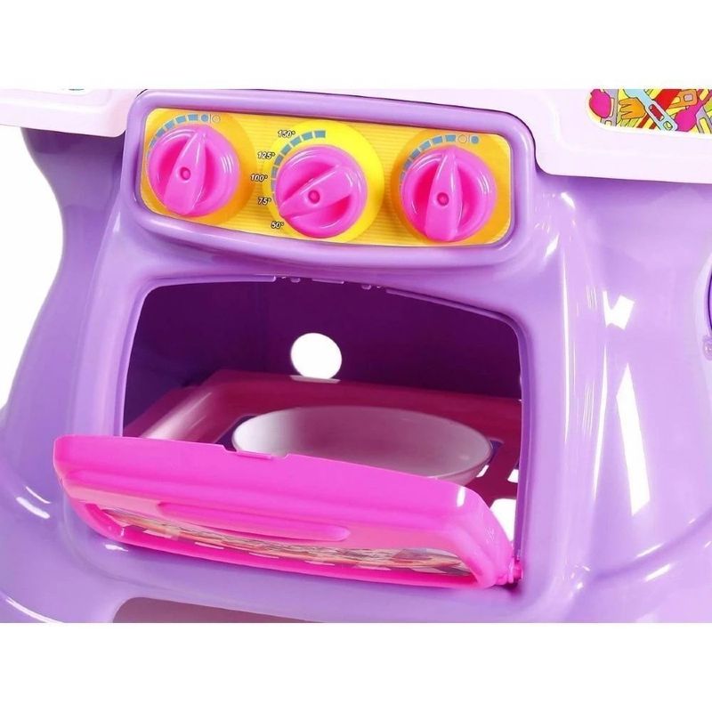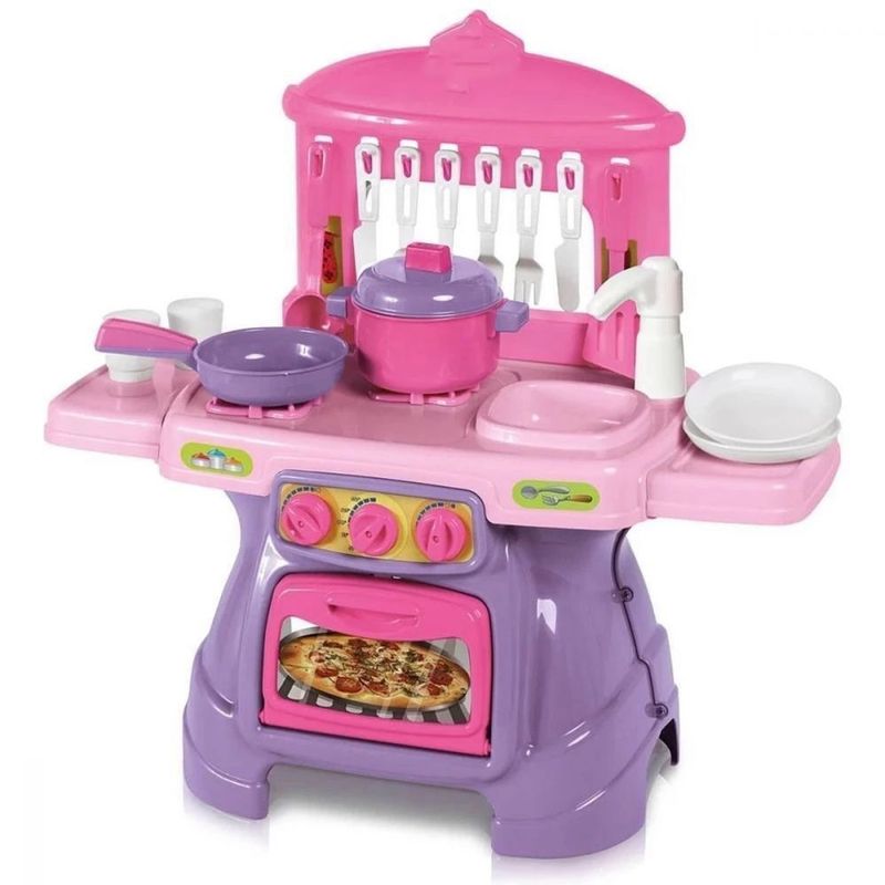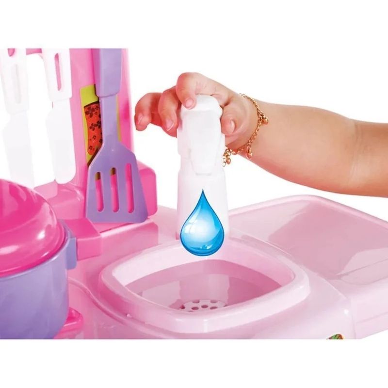 Esta super cozinha possui vários acessórios como, panelinhas, pratos, copos, facas, entre outros acessórios, igualzinha a cozinha da mamãe. Além disso, a pia sai água de verdade para as crianças fazerem comidinhas ou lavar toda a louça no final de sua refeição. Nela dá para cozinhar e lavar os pratos, talheres, copos e panelinhas. Possui torneira com sucção, acompanha pratos, talheres, panela frigideira e copos.
