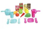 Conteúdo da embalagem: 1 maleta, 2 panelinhas, 3 frutas, 4 caixinhas, 2 pratos, 2 copos, 2 facas, 2 garfos.