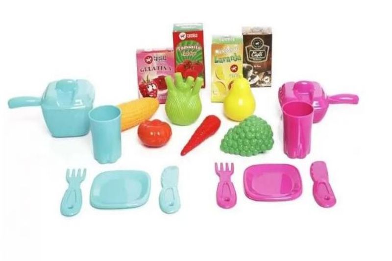 A brincadeira fica completa com panelinhas, pratinhos e talheres e frutas, e caixinhas.