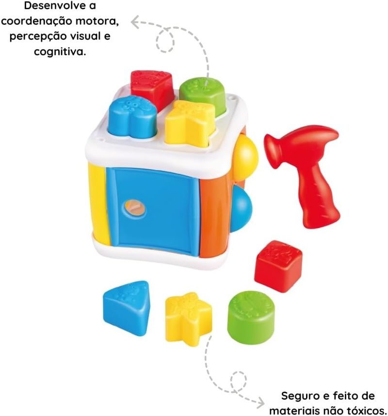Com peças que se encaixam em diferentes formatos e um martelo super divertido, o brinquedo auxilia no desenvolvimento da coordenação motora, percepção espacial e habilidades cognitivas.