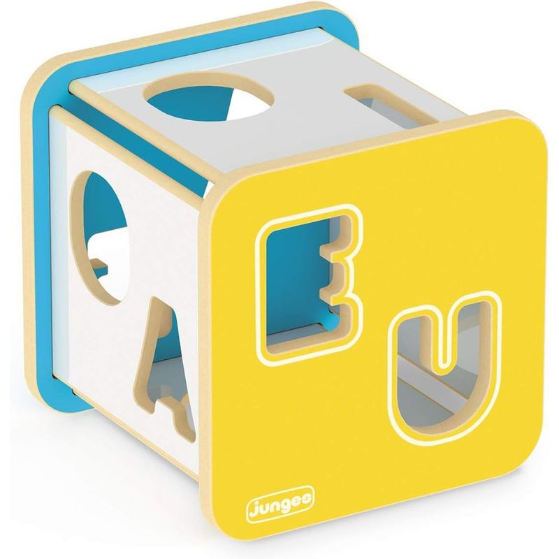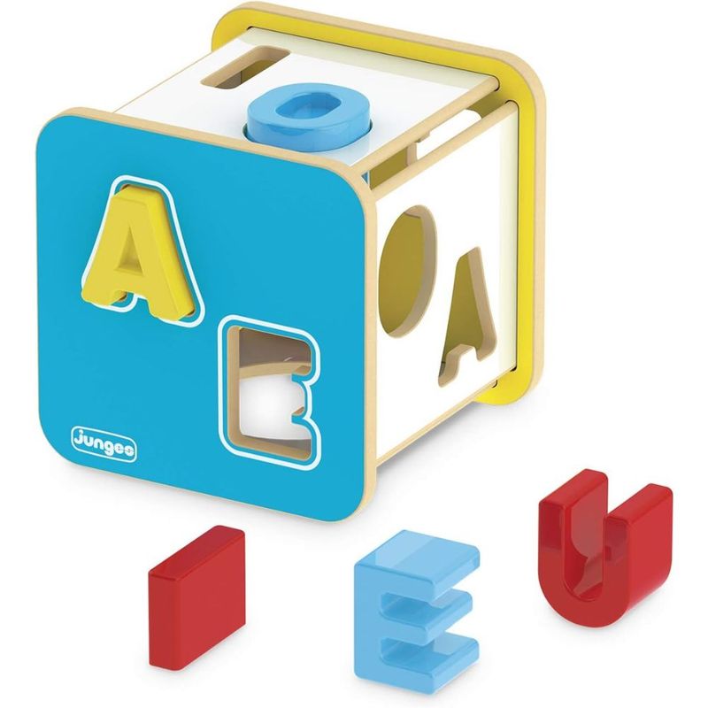 Cubo Didático da Junges em madeira de reflorestamento (MDF) no tamanho 15x15x15cm com pintura atóxica e acabamento em serigrafia. Acompanha 1 kit com 5 peças plásticas coloridas e ergonômicas - letras vogais (A, E, I, O, U). Diversão pra todo lado!