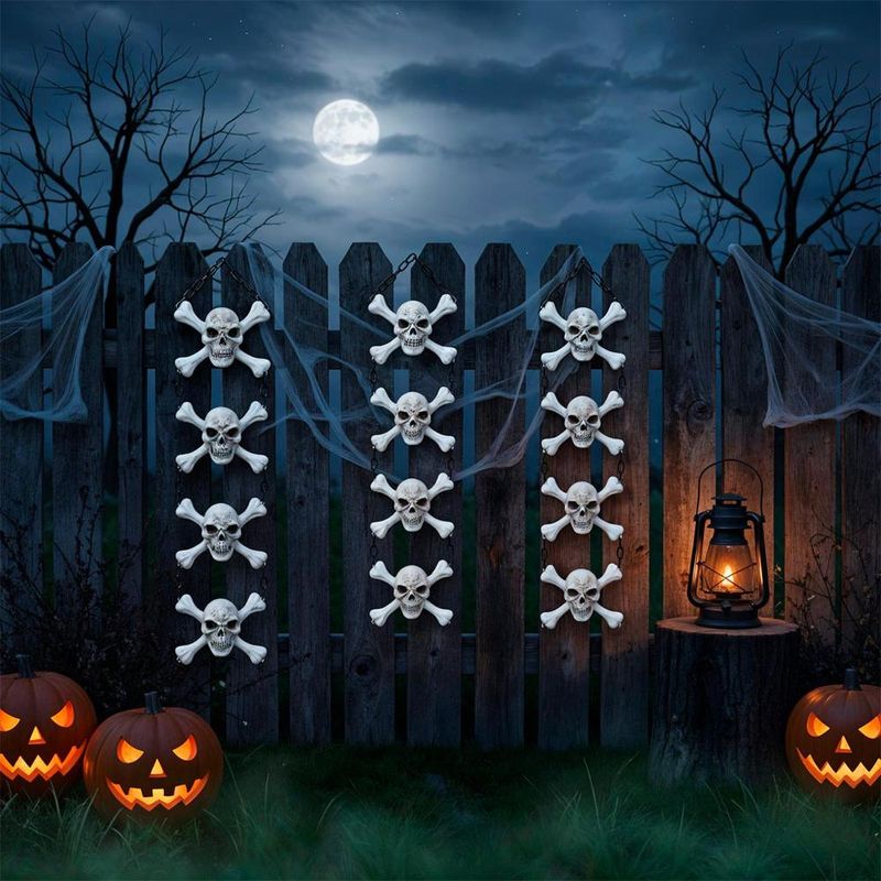 Adicione um toque de terror à sua decoração de Halloween com este enfeite de Caveiras Acorrentadas para pendurar. Este móbile apresenta quatro caveiras de plástico realistas com ossos cruzados, interligadas por correntes pretas, criando um visual macabro ideal para festas temáticas, casas mal-assombradas e celebrações de Dia das Bruxas. Leve e fácil de instalar, é a peça perfeita para decorar portas, paredes ou criar um cenário assustador. Itens inclusos: 1x Móbile de caveiras