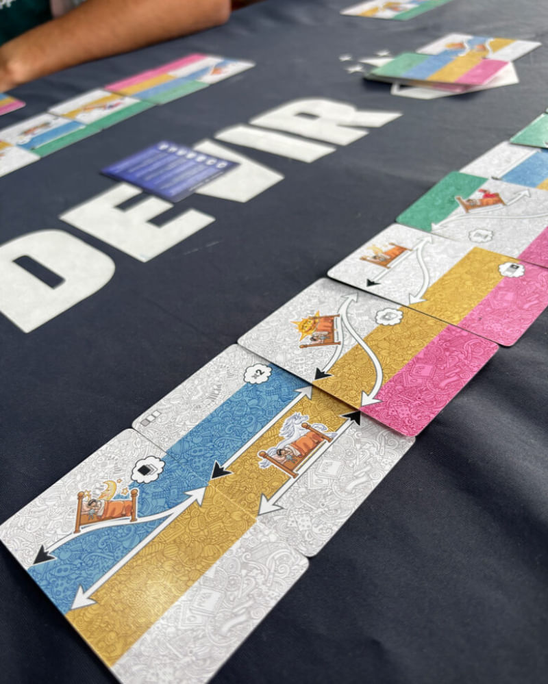 O pequeno Bruno foi dormir e agora viaja pela terra dos sonhos. Sua missão como Guardiões dos Sonhos é garantir que ele tenha os sonhos mais agradáveis ??e que não acorde durante a noite! Prepare-se para entrar no mundo dos sonhos e garantir que o Bruno tenha uma noite de bons sonhos! Projetado por Santiago Zanón e ilustrado por David Esbrí, este jogo de cartas pode ser apreciado por grupos de 2 a 6 jogadores, a partir de oito anos de idade, em sessões curtas de 10 a 15 minutos. Seu objetivo em Deep Dreams é ajudar Bruno a ter os sonhos mais doces. Os sonhos aparecem em quatro cores diferentes nas cartas de Sonho. Você deve formar os maiores Grupos de Sonhos de cores correspondentes possíveis jogando as cartas juntas. Mas você também precisa garantir que Bruno não acorde no meio da noite, criando um Caminho do Sono ininterrupto através de suas cartas. Você ganhará pontos extras se conectar setas pretas entre as cartas. No final do jogo (quando um jogador tiver 10 cartas em sua fileira), o jogador com mais pontos vence.
