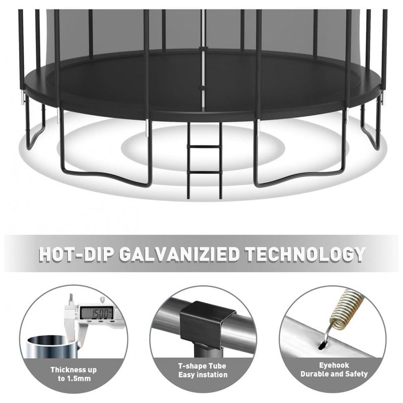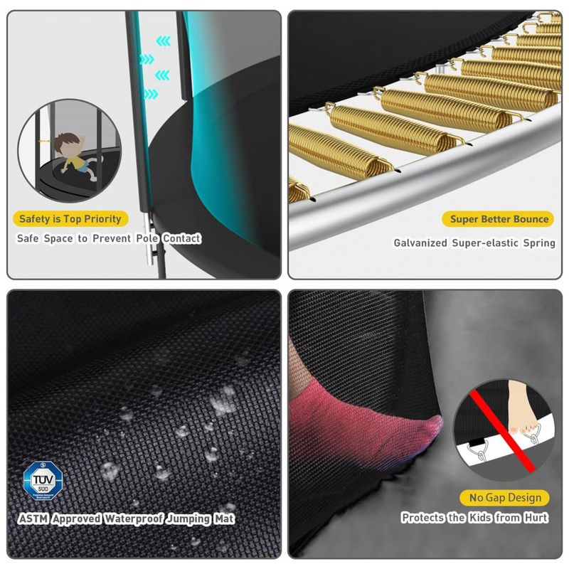 Trampolim DeepRoar para serviço pesado O trampolim DeepRoar adota o mais recente material de aço laminado a frio com 1, de espessura e a superfície é toda pulverizada com revestimento galvanizado, que é mais forte e antiferrugem e anticorrosão. Materiais de alta qualidade aumentam a capacidade de peso do trampolim de 16 para 1.500 libras, que pode suportar 2 a 5 crianças ou 1 a 3 adultos. O trampolim DeepRoar está em conformidade com ASTM F381 16, F2225 15, certificado CPC e relatório CPSIA. DeepRoar é a melhor escolha para o trampolim do seu quintal. Mais acessórios, mais felicidade Para garantir que o que você vê é o que você ganha, DeepRoar embala todos os acessórios em duas caixas em vez de uma, garantindo que o trampolim de 16 pés será entregue a você nas melhores condições. O trampolim DeepRoar inclui todas as peças: 1 trampolim de 16 pés, 1 escada alargada, 1 aspersor de trampolim, 1 luz de trampolim, 8 meias de trampolim, 6 estacas de vento. A parte superior da rede de segurança ampliada e atualizada oferece um local exclusivo para acessórios de suspensão. DeepRoar presta mais atenção aos detalhes A estrutura inferior do trampolim DeepRoar de 16 pés é composta por 6 pernas de base em U, proporcionando 12 pontos de equilíbrio, equipada com 12 postes de suporte de rede, o dobro de outros trampolins. A parte superior dos postes de suporte é combinada com tampas atualizadas, que podem fixar firmemente a rede de segurança para manter seus filhos em uma área de salto segura. A extensão da perna e as pernas base são todas atualizadas desde a fixação do parafuso até a fivela de mola, que é mais forte e fácil de instalar. Experiência de salto atualizada O trampolim DeepRoar adota uma almofada de cobertura de mola de 2 peças atualizada, que pode cobrir as molas em todas as direções, tornando o um trampolim verdadeiramente sem lacunas. O trampolim de 16 pés com rede de segurança de alta densidade para evitar pular ou subir no trampolim. O tapete de salto superelástico foi testado 50.000 vezes e a capacidade máxima de peso pode chegar a 1.500 libras. O trampolim 16 com 108 molas galvanizadas espessadas atualizadas, trazendo a melhor experiência de salto. Fácil de instalar e política de garantia DeepRoar adotou as opiniões dos usuários e atualizou as instruções de instalação fáceis de seguir, com imagens claras e maneiras simples de configurar seu trampolim de 16 pés mais rápido, sem necessidade de contratar alguém para instalar, faça você mesmo pode concluir a instalação dentro de 2 horas. O trampolim DeepRoar oferece 30 dias de reembolso gratuito, 24 meses de garantia, serviço online 24 horas por dia, 7 dias por semana. Se você tiver alguma dúvida, não hesite em nos contatar