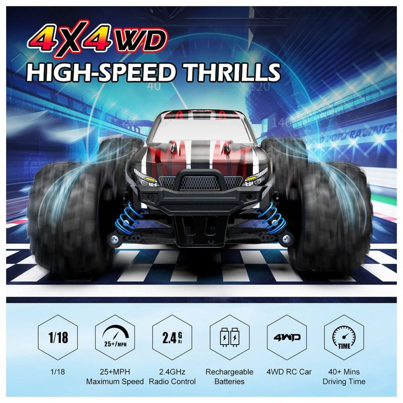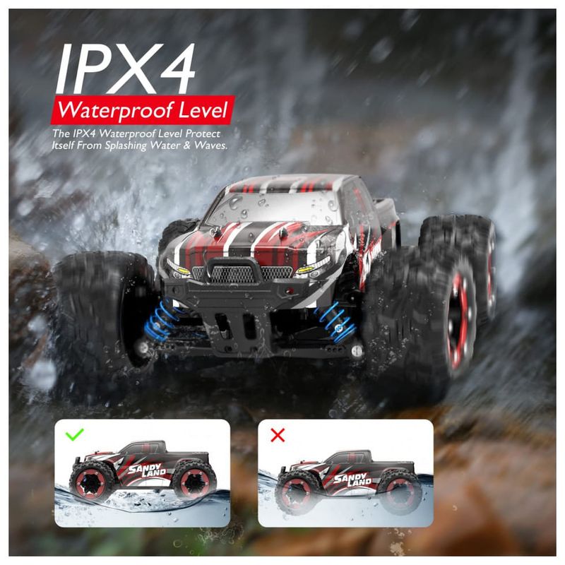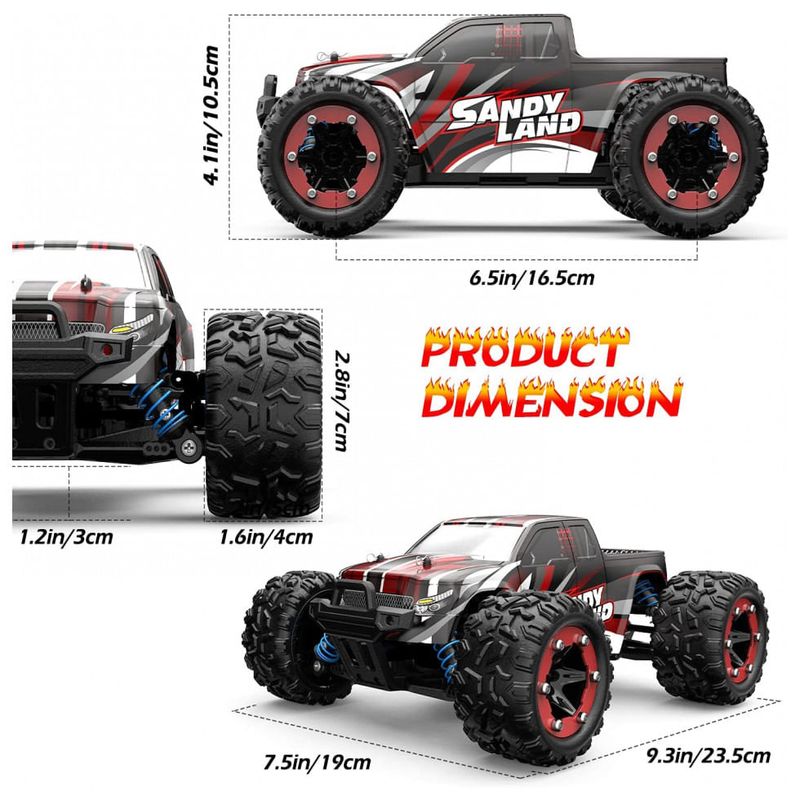 Moter com dissipador de calor profissional de metal O monster truck está equipado com um motor 380 que pode executar 21500 rotações por minuto, o que fez um grande aprimoramento para a aceleração e permite que o carro RC alcance uma velocidade máxima de 40 km , h. Há um dissipador de calor de metal que cobre totalmente o motor para aumentar a dissipação de calor do motor e estender sua vida útil. Observe que o motor fica aquecido quando o caminhão é conduzido por um longo período. Recomendamos que você faça uma pausa intermitente após 15 minutos de carro.
