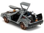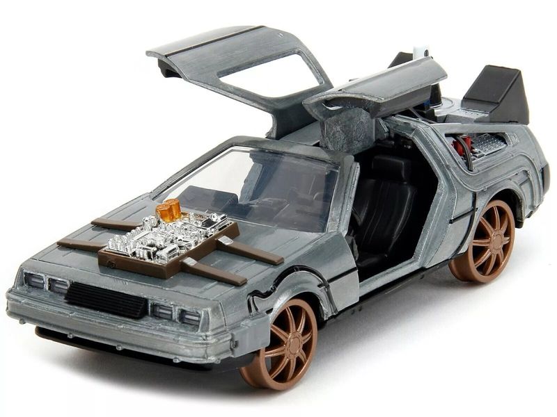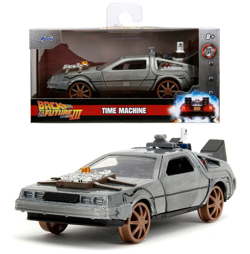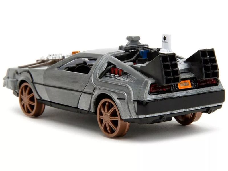 Delorean DMC-12 - Time Machine c/ Rodas de TremMarca do produto: Jada.Coleção: Hollywood Rides.Filme: De Volta para o Futuro 3Escala: 1/32 (aproximadamente 13 cm de comprimento).Pneus de Borracha.Miniatura em Metal com partes de plástico.Abre as portas.