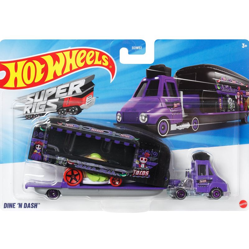 Dine 'n Dash + Car-de-Asada Marca do produto: Hot Wheels - Mattel. Coleção: Super Rigs - Caminhões de Transporte Escala: 1/64 (Carrinho: comprimento: 5,5 cm; Caminhão: comprimento 19 cm)