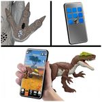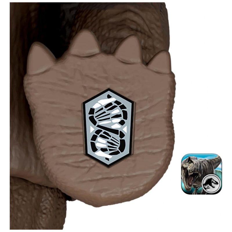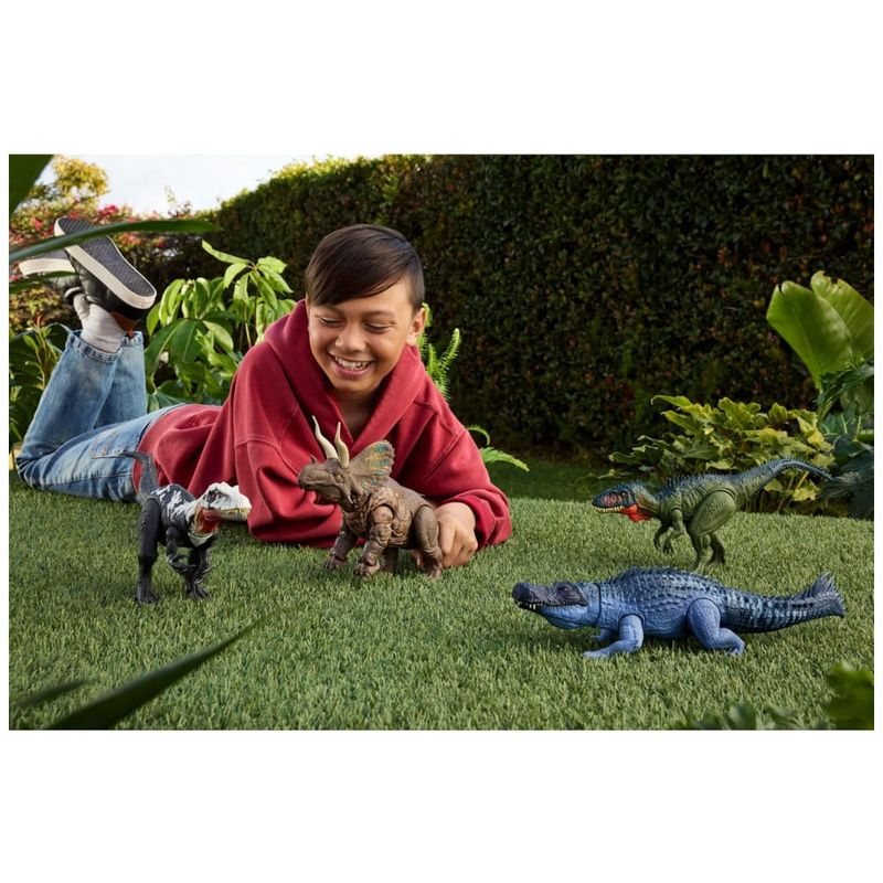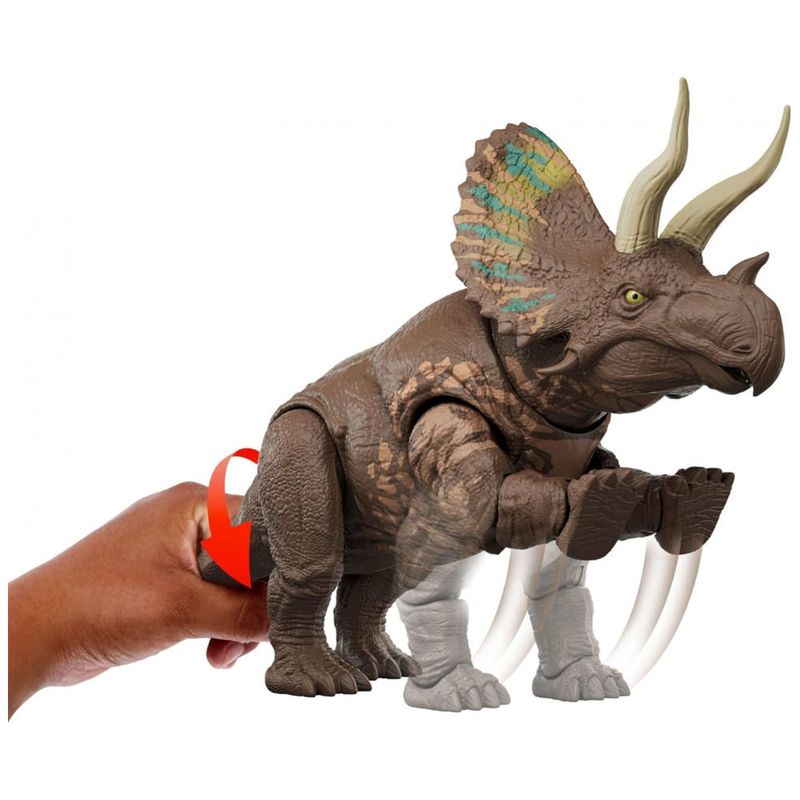 O modelo possui sistema “Gigantic Thrashers” com dois movimentos de ataque acionados pela cauda: ao movimentar a cauda para cima e para baixo, a figura realiza um ataque de cabeçada; ao mover a cauda lateralmente, executa um ataque com pata levantada simulando pisoteio. A figura inclui código de rastreamento sob o pé para escaneamento no app Jurassic World Play, desbloqueando versão digital do dinossauro, AR e minijogos com veículos em terra, ar e mar.?
