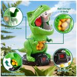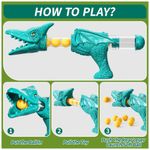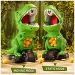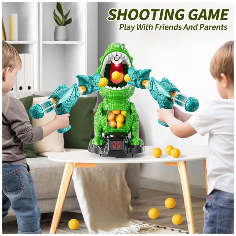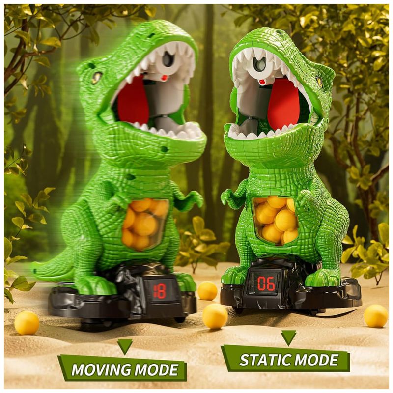 Brinquedo de dinossauro de tiro JUKUDAHU desenvolvido para crianças a partir de 3 anos, com estrutura móvel, placar e sistema de ar para lançamento de bolas de espuma, indicado para uso em ambientes internos ou externos. O brinquedo combina alvo em formato de dinossauro com reservatório de bolas, movimento sobre rodas e efeitos de luz e som, oferecendo uma experiência de jogo interativo com contagem de pontos.