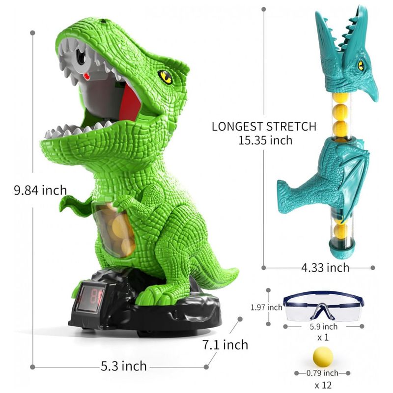 O dinossauro possui língua como área de acerto, braço articulado, roda para modo móvel ou fixo e compartimento interno para armazenamento das bolas, facilitando o uso contínuo durante a brincadeira. O lançador de ar permite inserção de bolas de espuma, bombeamento manual e disparo direcional, contribuindo para coordenação motora e mira das crianças.