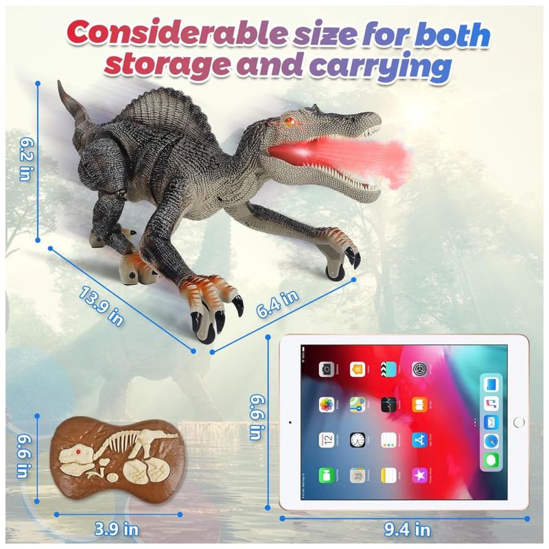 A bateria de longa duração garante horas de diversão, tanto em ambientes internos quanto externos, e o fato de ser recarregável torna o brinquedo ainda mais conveniente. A montagem é fácil e rápida, sem a necessidade de ferramentas complicadas ou acessórios adicionais. Este robô dinossauro é um presente de aniversário ideal para crianças que adoram dinossauros e brinquedos interativos. Com certeza, elas vão adorar controlar e interagir com seu próprio Spinosaurus que ruge e pulveriza.