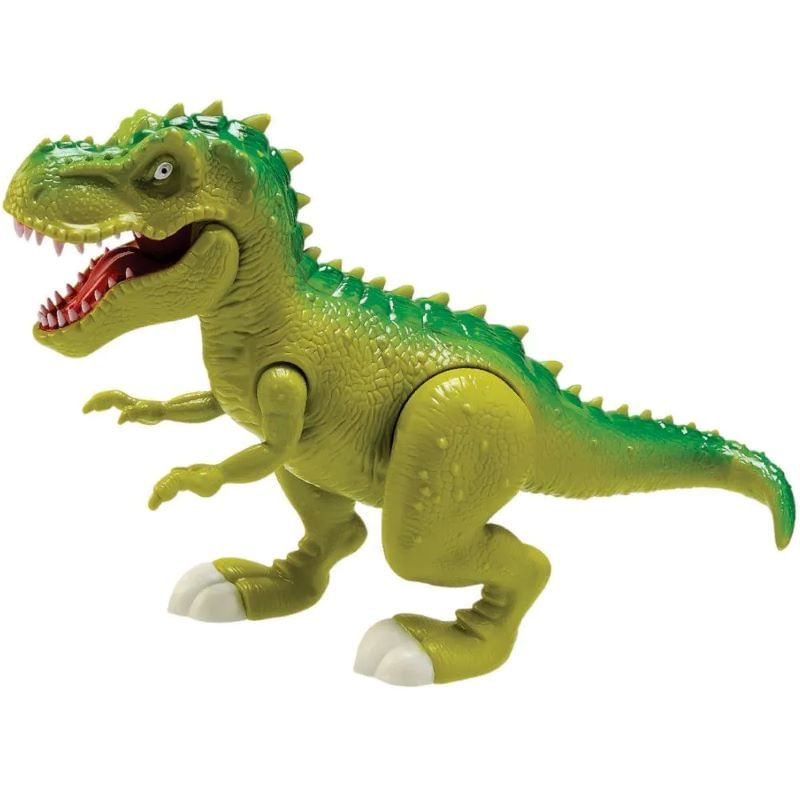 O Dinossauro Tiranosssauro Attack Adijomar é articulado e mede aproximadamente 37cm de comprimento. Inclinando a cabeça do Tiranossauro, ele faz sons, seus olhos acendem e faz movimento de mordida .(Verde e Marrom)