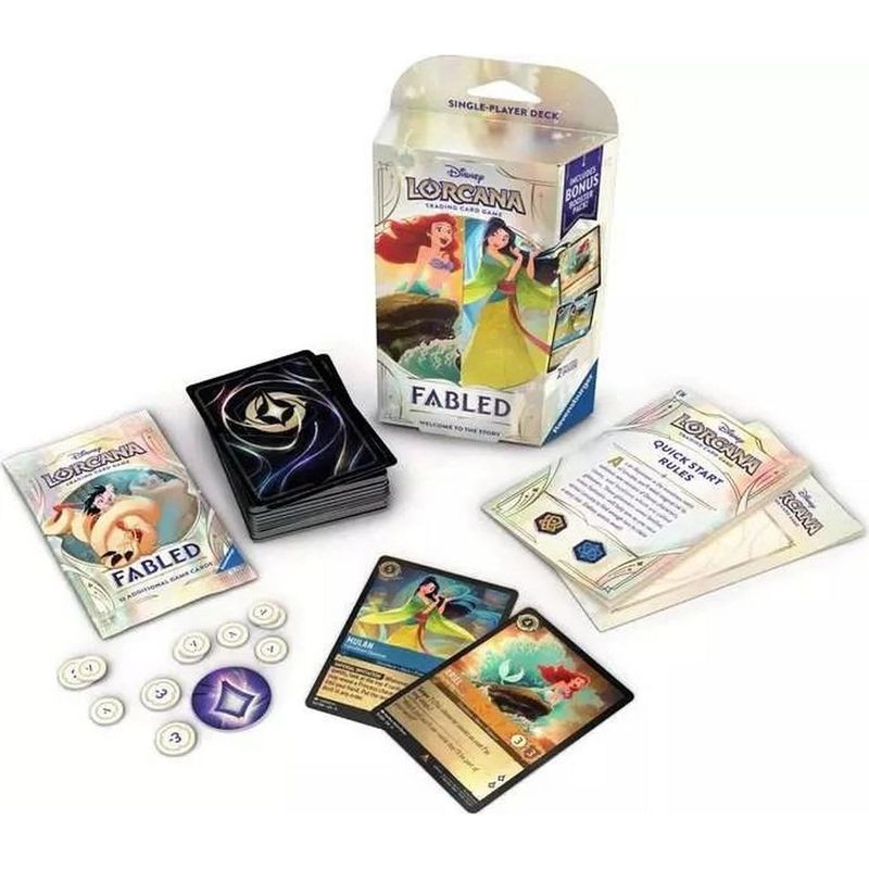 Disney Lorcana: Fabled - Player Single-Player Deck Produto Importado pela Copag. Cartas em Inglês. Marca: Ravensburger Cada baralho para do Disney Lorcana TCG inclui tudo o que um jogador precisa para começar a jogar imediatamente. Através desses baralhos, os jogadores experimentam a rica história e os diversos personagens do Disney Lorcana TCG. Cada baralho pré-montado contém 60 cartas e apresenta cartas de duas tintas diferentes, cada uma com estilos de jogo distintos. O Deck contém: - 1 baralho de 60 cartas, incluindo 2 cartas metalizadas. - 1 contador de dano. - 1 tapete de jogo de papel. - 1 ficha de rastreamento em papel. - Manual de Início Rápido. - Pacote bônus com 12 cartas aleatórias. Produto original, em inglês, com certificação de segurança INMETRO.