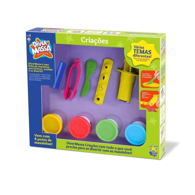 O kit Criações vem com 4 potinhos de massinha de 50g cada, seringa com ponta aplicadora de massa, faca sem corte, pegador e rolinho. Os produtos Diver Massa auxiliam na coordenação motora, estimulam a criatividade e imaginação, e garantem a diversão dos pequenos!
