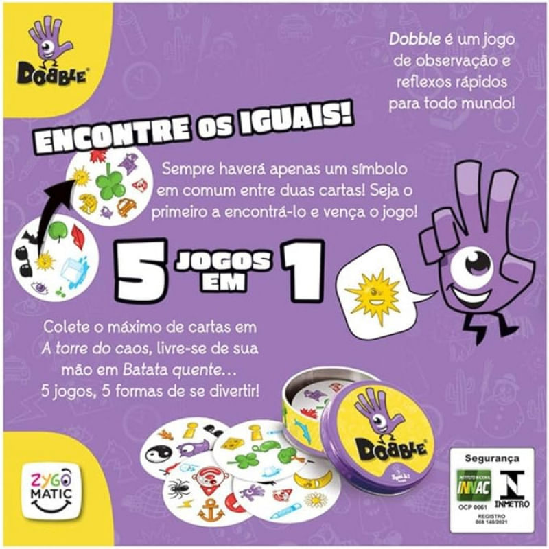 DOBBLE - GALÁPAGOSDescubra a emoção e a diversão com Dobble, o jogo de tabuleiro que se tornou um sucesso mundial! Ideal para todas as idades, Dobble é um verdadeiro desafio de velocidade e observação onde todos jogam ao mesmo tempo. Composto por 55 cartas, cada uma com 8 símbolos únicos, o objetivo é simples: identificar rapidamente o símbolo em comum entre duas cartas. A simplicidade das regras torna Dobble fácil de aprender, mas a dinâmica de jogo mantém todos os participantes engajados e competindo para vencer. Seja em festas, reuniões de família ou viagens, Dobble é compacto e portátil, garantindo que a diversão esteja sempre ao seu alcance. Perfeito para testar suas habilidades de observação e reflexos, Dobble promete muitas risadas e momentos inesquecíveis. Não importa a idade, todos têm a mesma chance de ganhar, então prepare-se para uma competição emocionante e divertida!