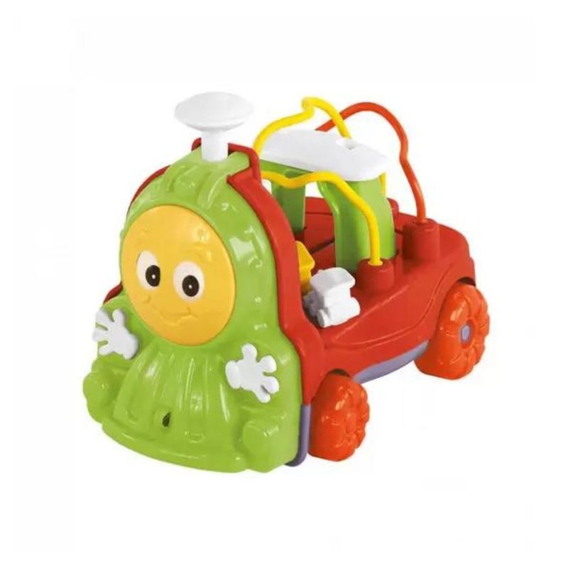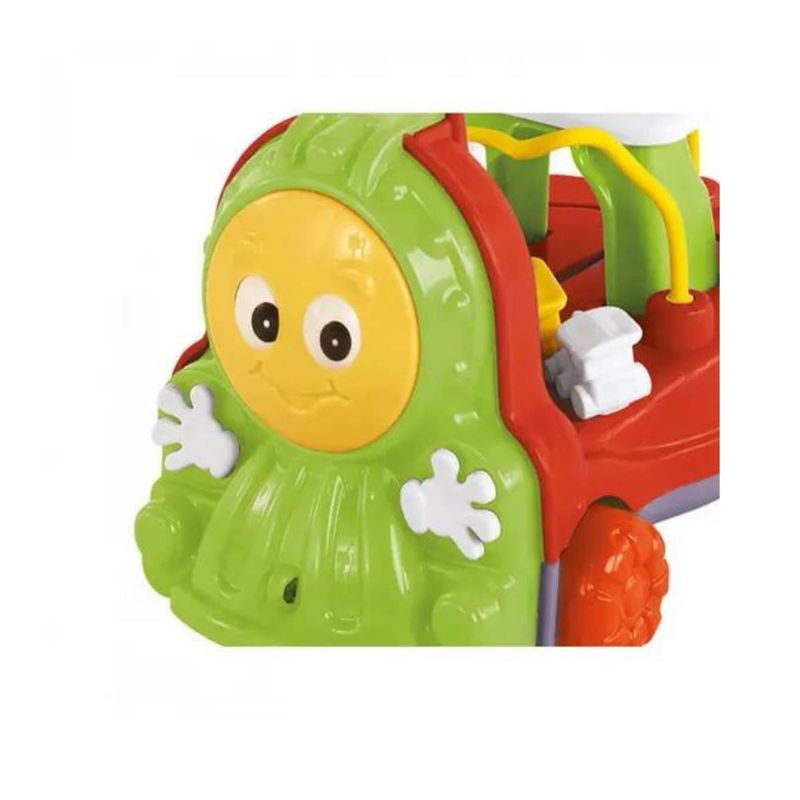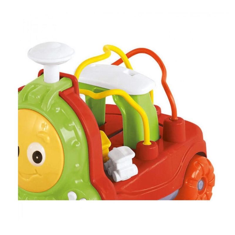 As mãozinhas e os olhos se mexem ao empurrar o trem e na parte superior há trenzinhos para brincar de deslizar nos trilhos.