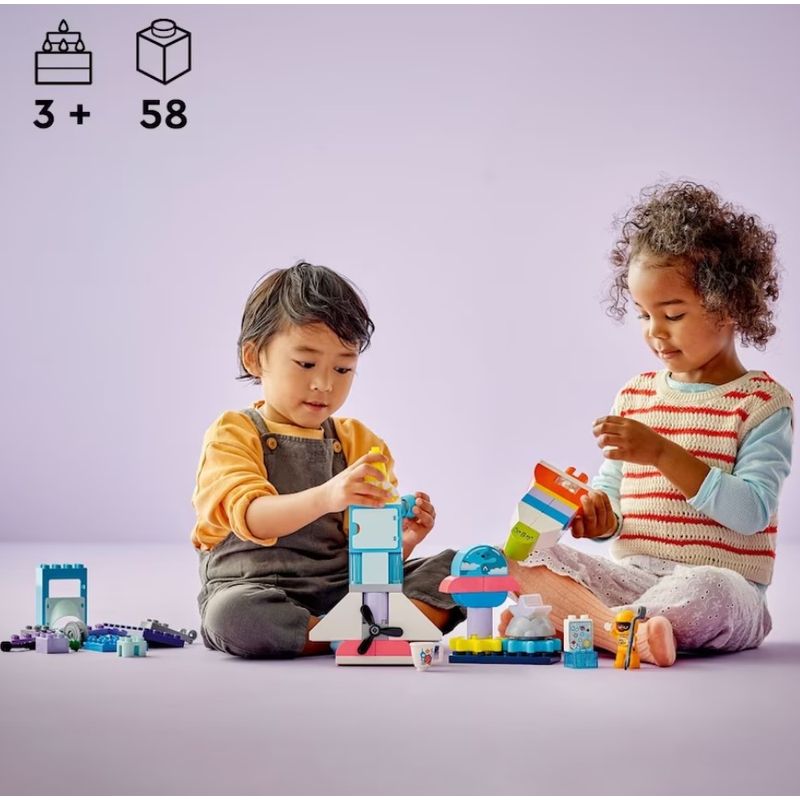 • O brinquedo espacial 3 em 1 construído com peças proporciona às crianças horas de diversão na construção e reconstrução • Este versátil brinquedo de nave espacial vem com 58 peças e 2 figuras LEGO® DUPLO® • Um brinquedo educativo que ajuda as crianças a desenvolver suas habilidades motoras finas • As baterias estão incluídas para que as crianças podem se divertir no espaço sem demora • Presente científico para crianças a partir de 3 anos que adoram brinquedos de naves espaciais • Com os conjuntos de construção LEGO® DUPLO®, uma experiência de jogo segura é garantida • Os brinquedos LEGO® DUPLO® incentivam as crianças a sonhar grande com o mundo e além • Conjunto de 58 peças com um modelo de foguete medindo mais de 35 cm de altura