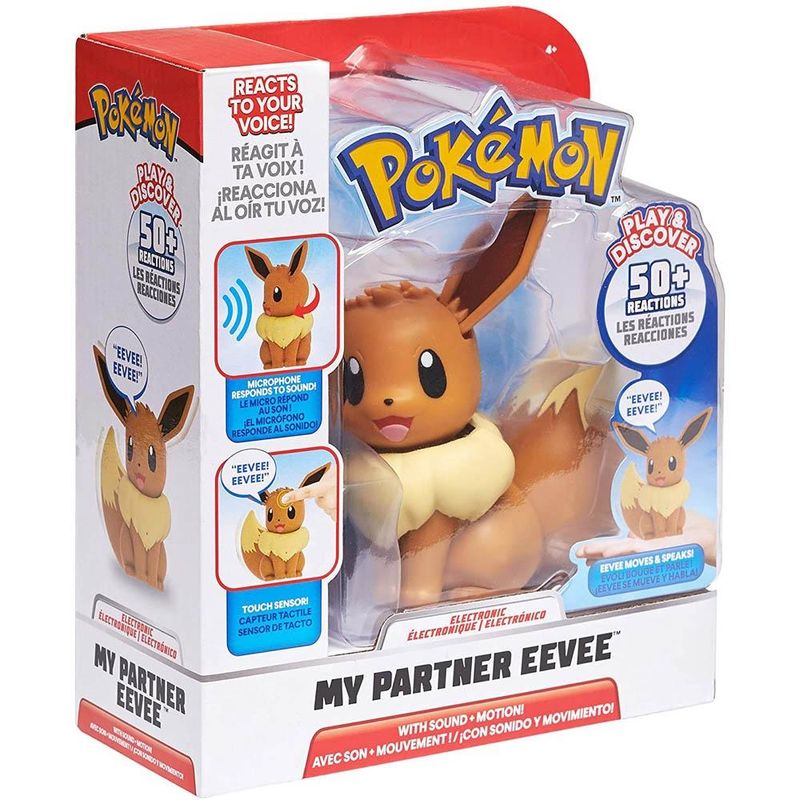 Brinque com Eevee de uma maneira totalmente nova! Meu Parceiro Pókemon Eevee tem um microfone embutido e tecnologia de sensor de toque que permite que você e o Eevee se comuniquem de uma maneira nova e divertida. Com mais de 50 reações diferentes ao seu toque, sua voz e até música, veja Eevee ganhar vida enquanto sua cabeça e cauda se movem! Eevee tem 20 efeitos sonoros e expressões icônicas e permite que você traga a emoção de se tornar um treinador Pokémon para o mundo real!