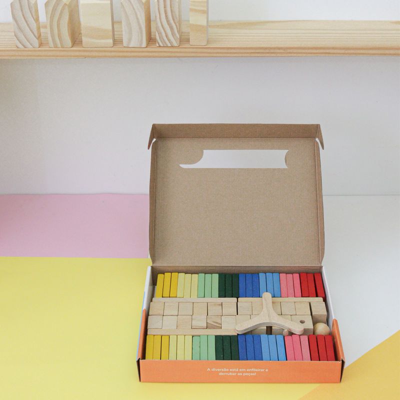 O objetivo desta brincadeira é enfileirar as peças de modo que, ao derrubar a primeira, todas caiam em um efeito dominó.