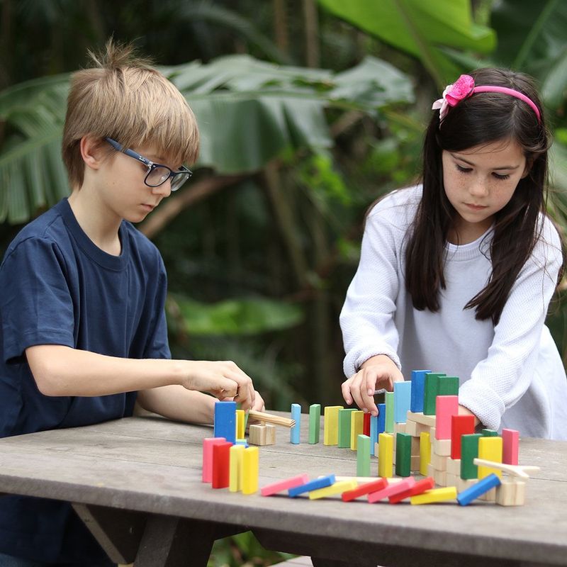 São 76 peças de pura diversão! O objetivo é enfileirar as peças de modo que, ao derrubar a primeira, todas caiam em um efeito dominó.