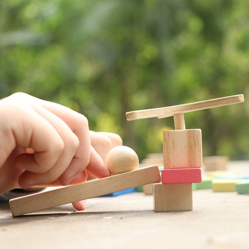 São 76 peças de madeira que formam divertidos circuitos com engrenagens, canaleta, bolinha, ponte, torres e o que a imaginação for capaz de inventar.