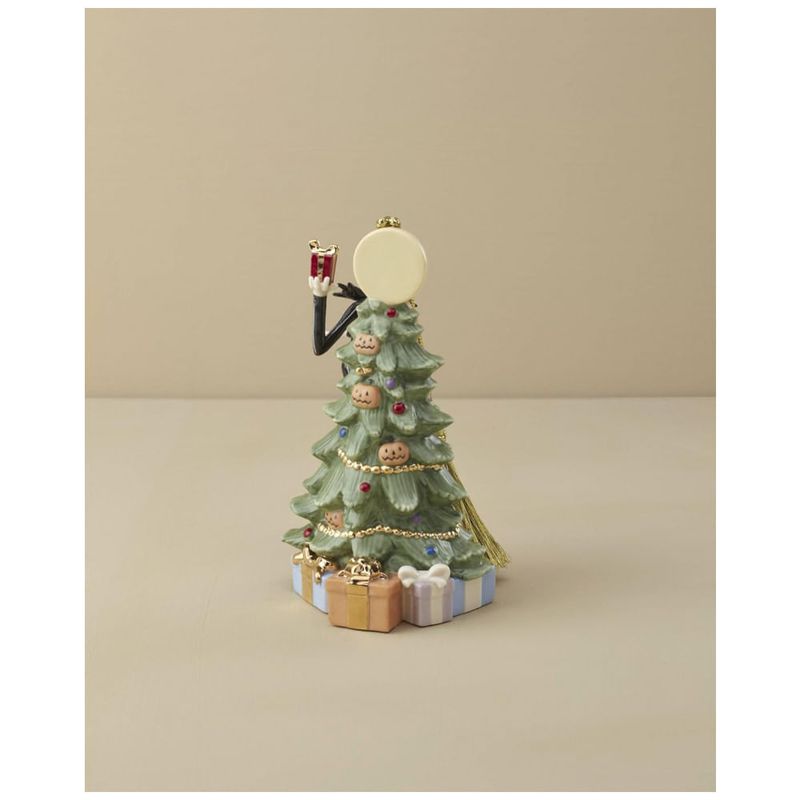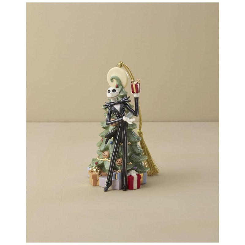 Celebre o Natal com um toque assustadoramente encantador com o enfeite Lenox The Nightmare Before Christmas. Este ornamento em porcelana apresenta Jack Skellington vestido como Papai Noel, decorando uma árvore em uma cena icônica do clássico filme de Tim Burton. Com detalhes pintados à mão e acabamentos em ouro 24K, o enfeite traz elegância e um charme único para sua decoração natalina. Ideal para fãs e colecionadores, é perfeito para pendurar na árvore com seu cordão dourado. Medindo aproximadamente 7,6 x 7,6 x 12,7 cm, é uma peça decorativa de alta qualidade e grande apelo visual importada para trazer nostalgia e magia às festas.