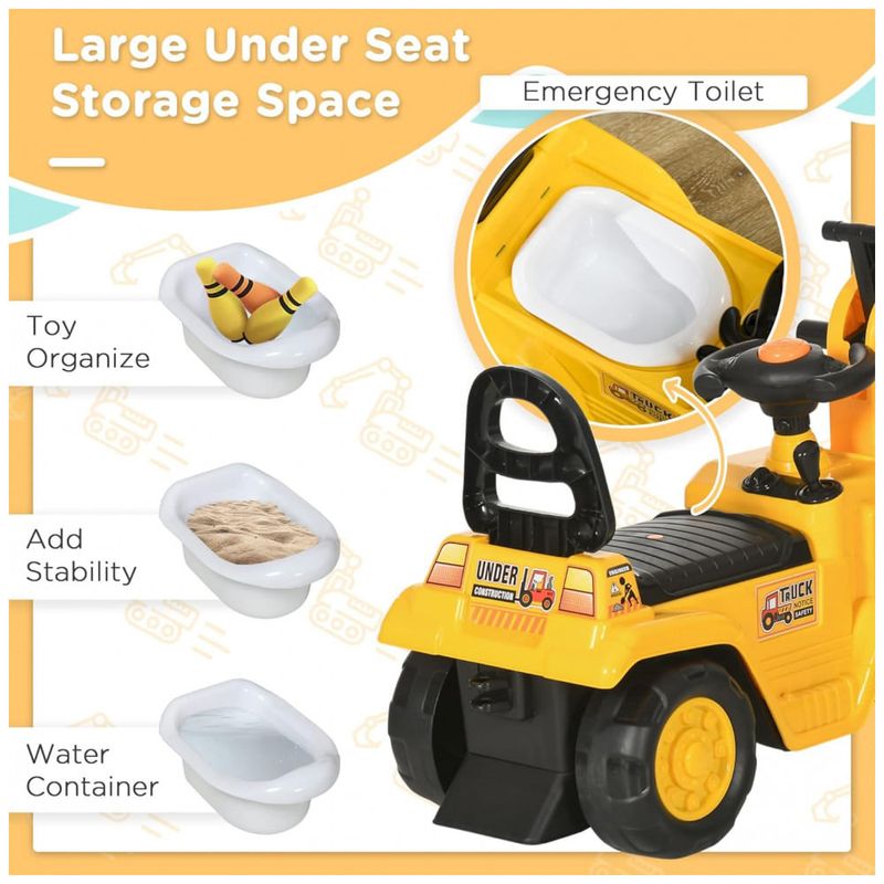 zenamento Sob o Assento: O brinquedo possui espaço de zenamento sob o assento, permitindo que as crianças levem consigo seus brinquedos favoritos enquanto se divertem. Além disso, uma buzina permite que elas emitam sons enquanto brincam.