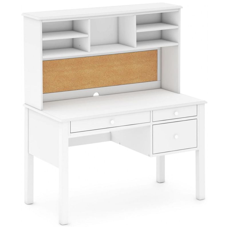 Conjunto infantil completo de escrivaninha, hutch e cadeira em madeira, desenvolvido para criar uma estação de estudo organizada para crianças a partir de 5 anos. A mesa oferece superfície ampla para escrita, leitura e computador, enquanto o hutch adiciona nichos, prateleiras e quadro de cortiça para organizar livros, materiais escolares, lembretes e trabalhos das crianças.?