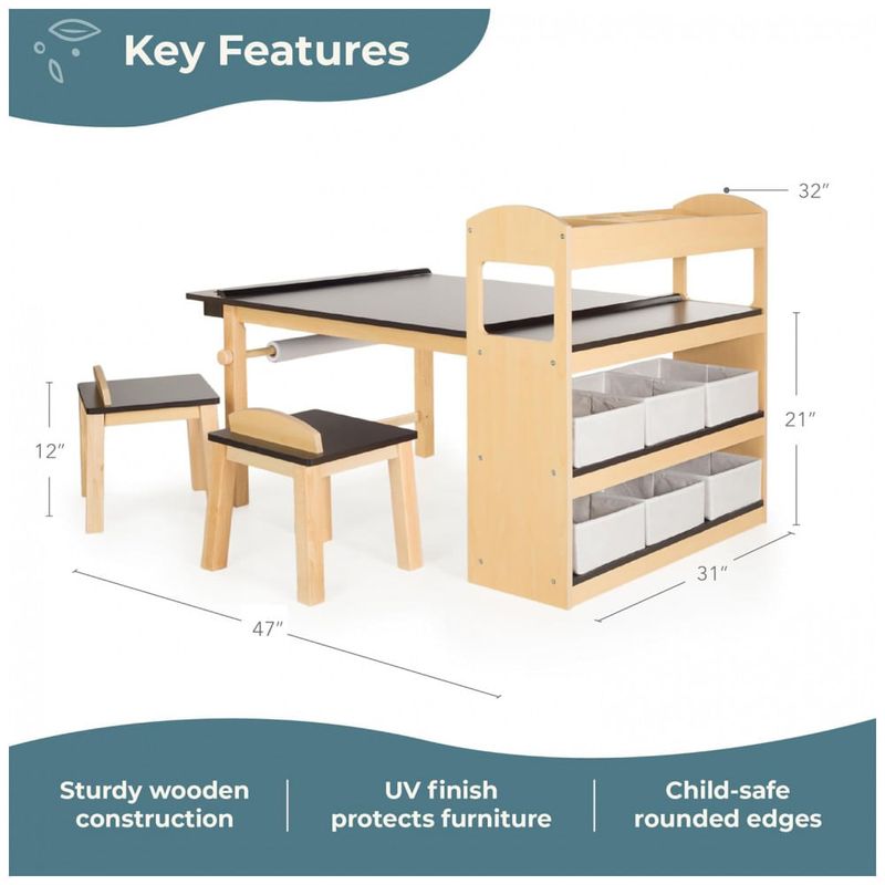 O Guidecraft Deluxe Art Center é uma estação completa de artes e atividades para crianças a partir de 3 anos, combinando uma mesa ampla, prateleiras de armazenamento, suporte para rolo de papel e dois bancos que se acomodam sob o tampo quando não estão em uso. A superfície de trabalho em birch/MDF possui acabamento UV liso e resistente a riscos, com recorte para passagem e organização do rolo de papel, criando um espaço adequado para desenho, pintura, colagem e outros projetos criativos para uma ou mais crianças.?