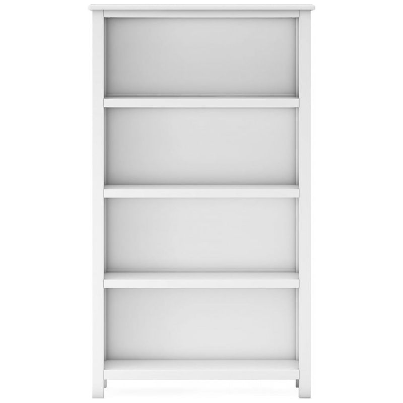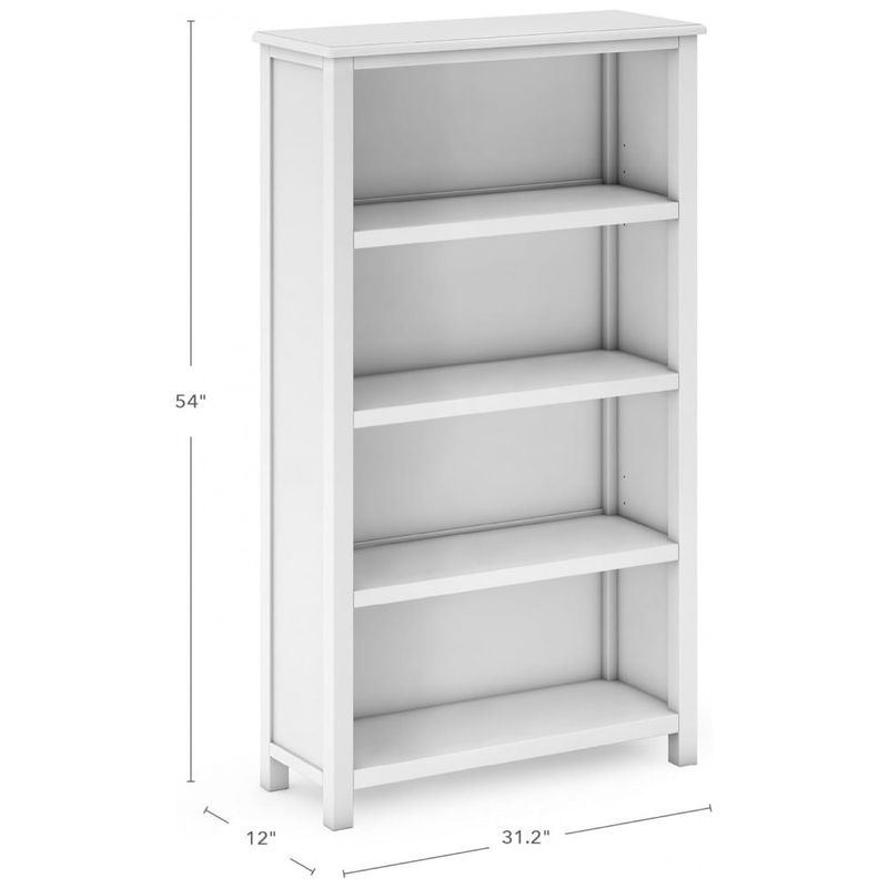 O móvel é fabricado em combinação de madeira maciça de pinus na estrutura com painéis em madeira engenheirada, em acabamento branco laqueado de fácil limpeza. As quatro prateleiras amplas e profundas acomodam livros em pé ou empilhados, caixas organizadoras e cestos, oferecendo espaço suficiente para articular materiais de arte, recursos pedagógicos e brinquedos em um único módulo vertical.?