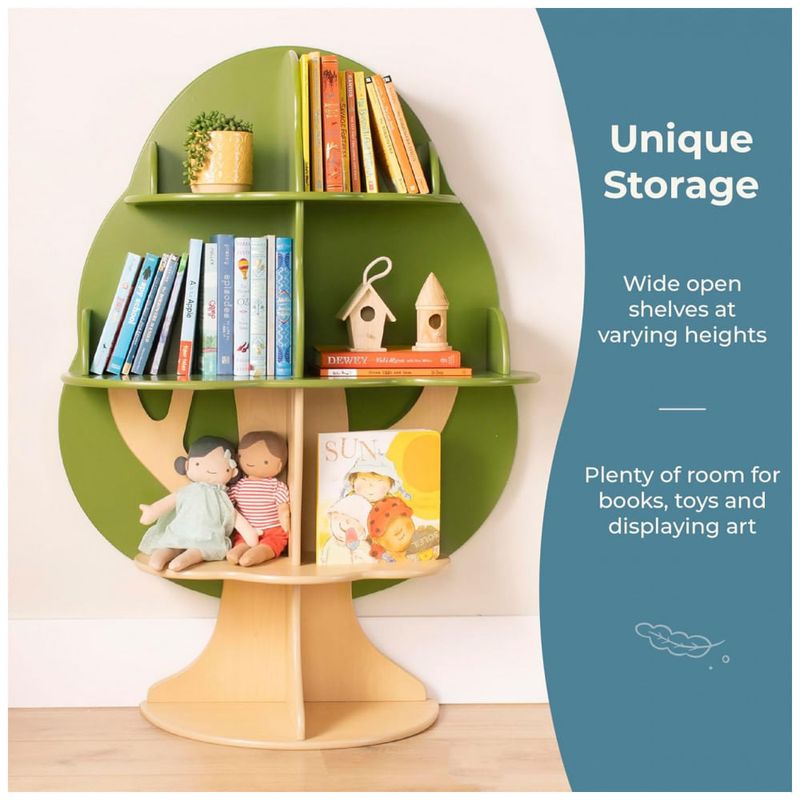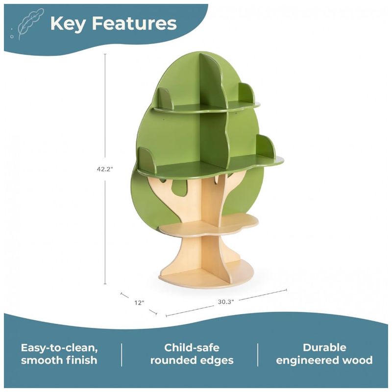 A estrutura é produzida em madeira engenheirada resistente, com cantos arredondados e superfície lisa de fácil limpeza, adequada para uso diário por crianças. O acabamento em tom de verde e o formato de árvore criam um ponto focal lúdico no ambiente, integrando decoração temática e solução funcional de armazenamento.?