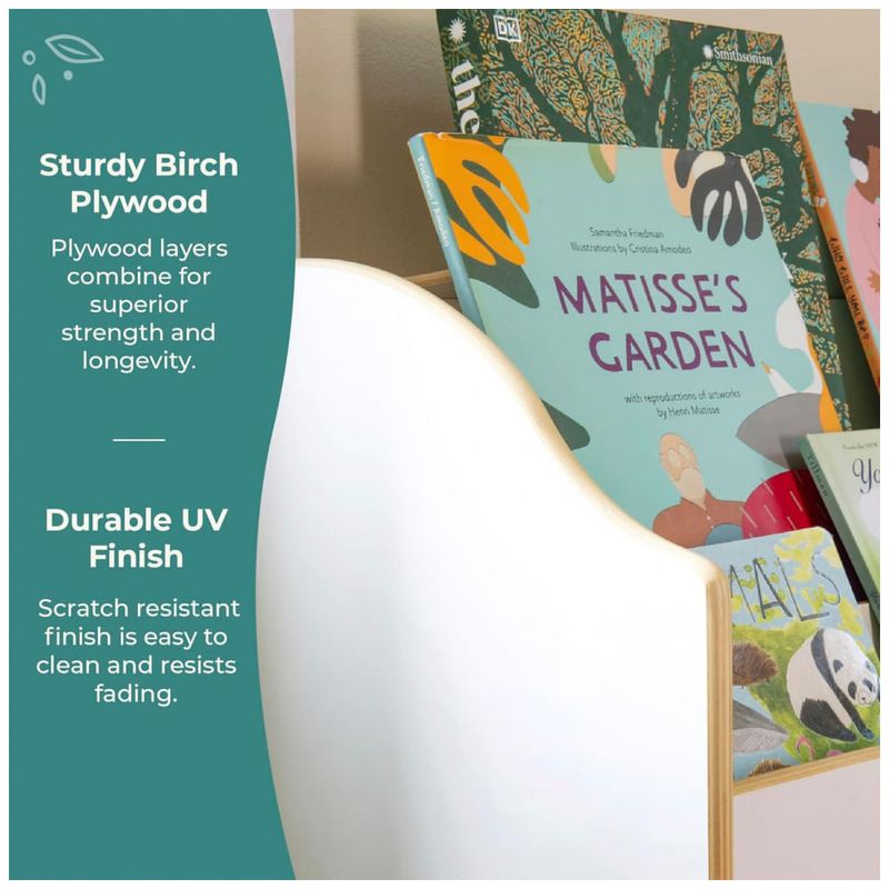 A estrutura é produzida em compensado de bétula com acabamento branco de fácil limpeza e bordas arredondadas, adequada para uso intenso em ambientes educativos. Na parte inferior, duas prateleiras largas acomodam seis caixas de tecido inclusas, ideais para guardar brinquedos, materiais de arte, jogos e outros recursos pedagógicos, mantendo o ambiente organizado e com tudo visível e acessível.?