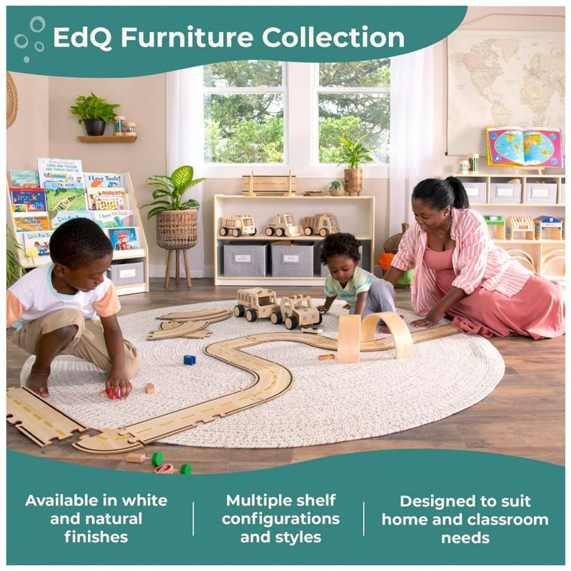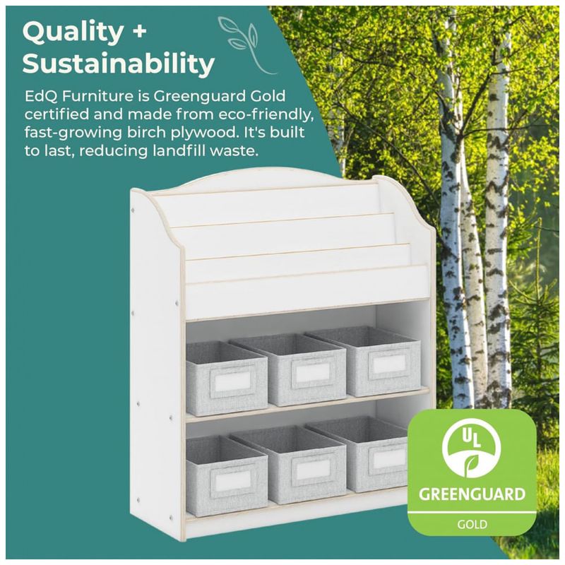 A limpeza recomendada é feita com pano seco ou levemente umedecido na estrutura, preservando o acabamento em bétula branca, enquanto as caixas de tecido podem ser removidas para aspiração ou limpeza pontual. A coleção EdQ da Guidecraft foi criada para atender a necessidades de organização em ambientes educativos, com móveis modulares robustos e proporções adequadas para crianças, apoiando autonomia na escolha e guarda de livros e brinquedos.?
