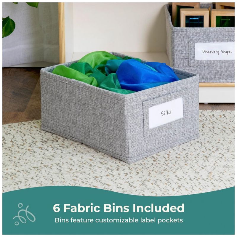 As seis caixas de tecido têm dimensões aproximadas de 20,8cm de largura, 27,2cm de profundidade e 13,5cm de altura, oferecendo compartimentos práticos para separar materiais por tipo ou grupo de crianças. A montagem é necessária e deve ser realizada por um adulto, com ferramentas, ferragens e instruções passo a passo inclusas.?
