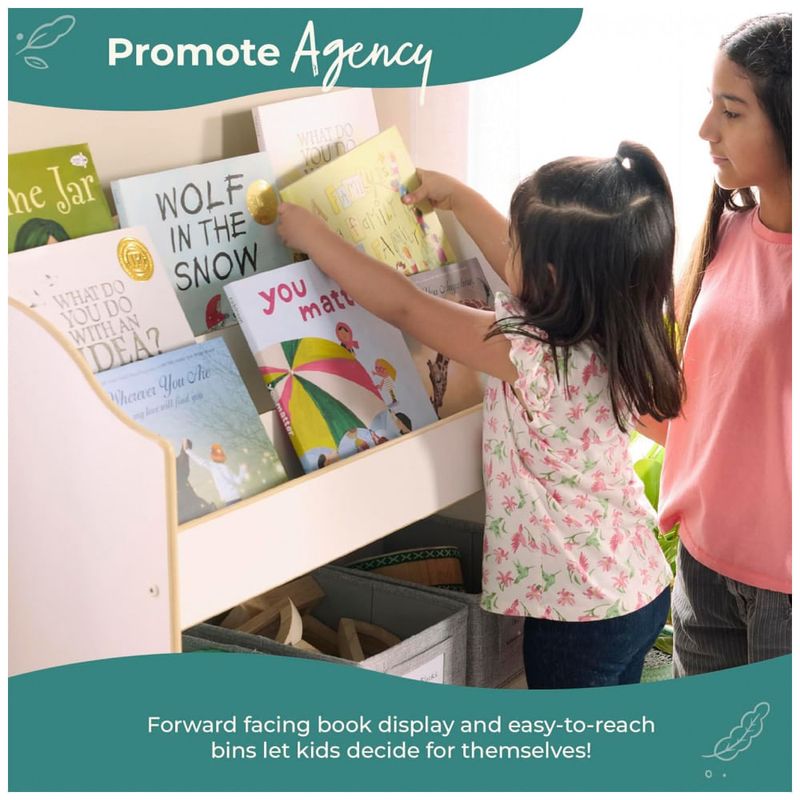 Estante infantil de piso com prateleiras em níveis e nichos inferiores, desenvolvida para organizar e expor livros, brinquedos e materiais de aprendizagem em salas de aula, espaços de homeschooling e áreas de brincar. As prateleiras superiores são inclinadas em degraus, exibindo as capas dos livros voltadas para frente, o que facilita a escolha autônoma pelas crianças e incentiva o interesse pela leitura.?