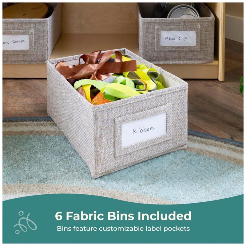 A estrutura é produzida em compensado de bétula resistente, com acabamento de fácil limpeza e bordas arredondadas, apropriada para uso intenso em ambientes educativos. Na parte inferior, duas prateleiras largas acomodam seis caixas de tecido inclusas, ideais para guardar brinquedos, materiais de arte, jogos, fantoches e outros recursos pedagógicos, mantendo tudo organizado e acessível.?