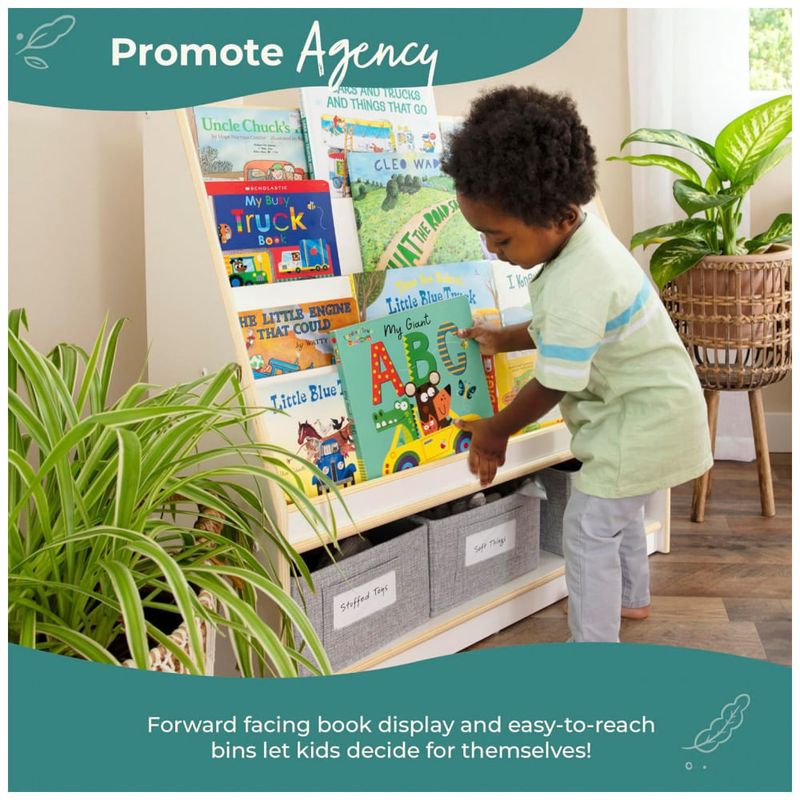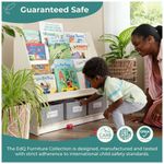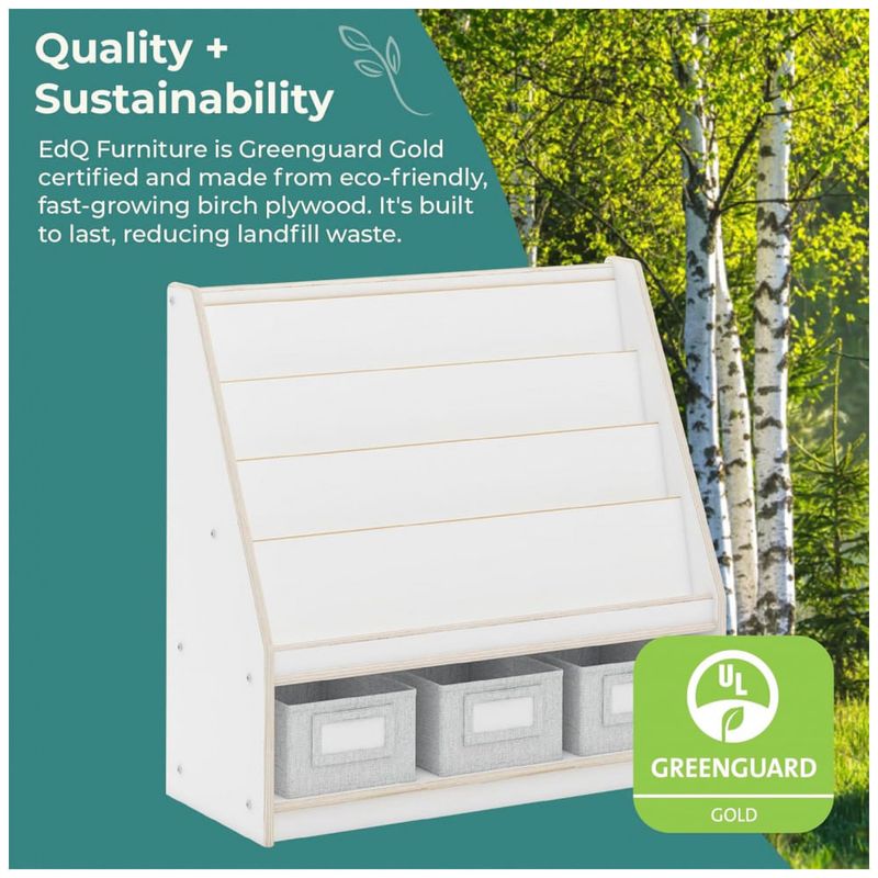 A Guidecraft EdQ Book and Bin Display branca é uma estante baixa infantil em madeira multilaminada de bétula, com acabamento de fácil limpeza e cantos arredondados, projetada para organizar livros, brinquedos e materiais em salas de aula, brinquedotecas e quartos infantis. A peça combina prateleiras superiores em níveis para exposição frontal de livros e uma prateleira inferior ampla que acomoda caixas de tecido para itens diversos.?