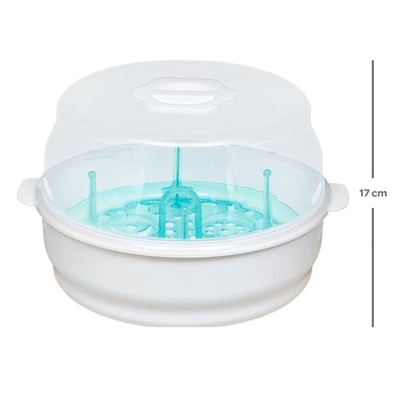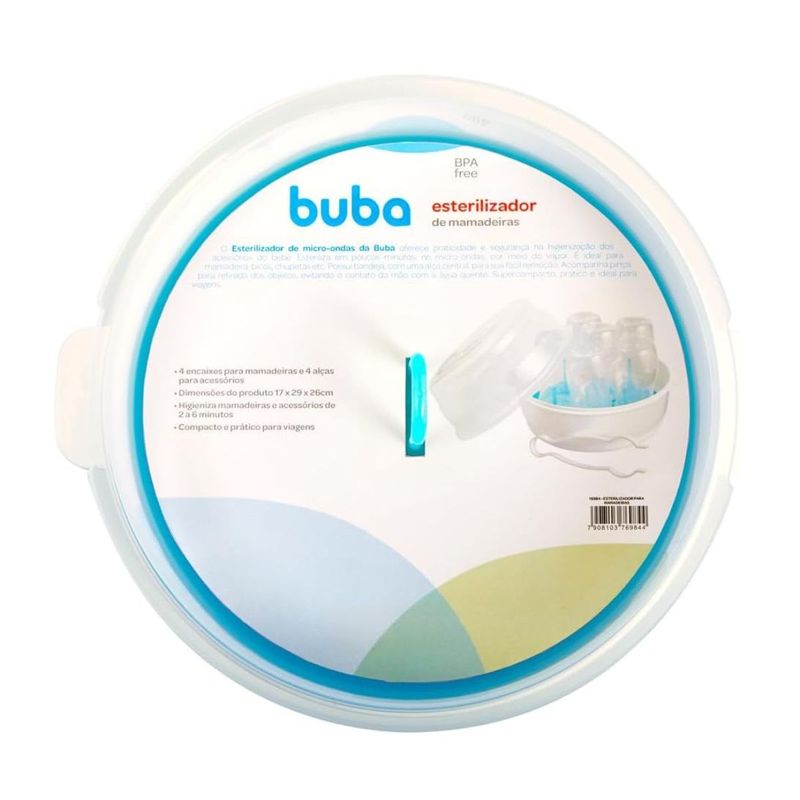O Esterilizador de micro-ondas da Buba oferece praticidade e segurança na higienização dos acessórios do bebê. Esteriliza em poucos minutos, no micro-ondas, por meio do vapopr. É ideal para mamadeira, bicos, chupetas, etc. Possui bandeja, com uma alça central, para sua fácil remoção. Acompanha pinça para retirada dos objetos, evitando o contato da mão com a água quente. Supercompacto, prático e ideal para viagens.