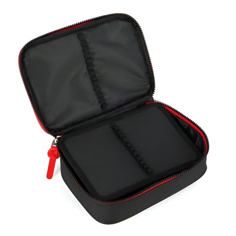 Cor Desafio: O estojo é predominantemente preto, com o acabamento da borda em vermelho vibrante.
