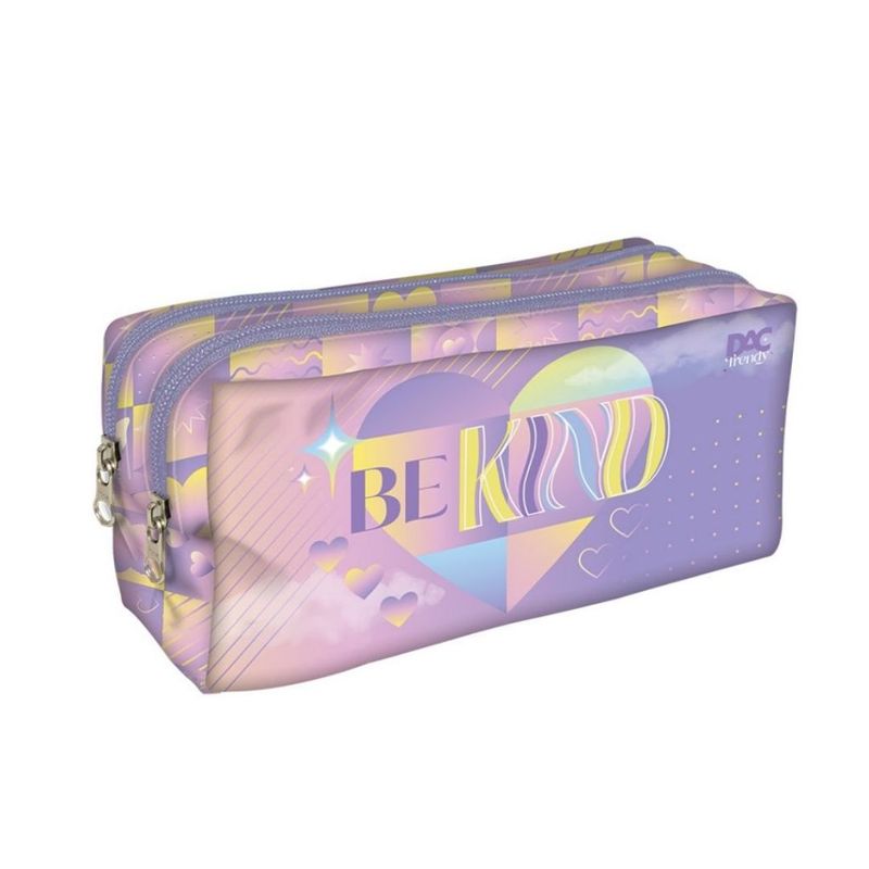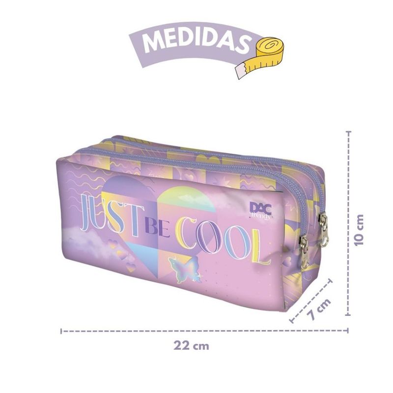 - Estojo resistente e detalhado com "Just Be Cool" e "Be Kind" na estampa;