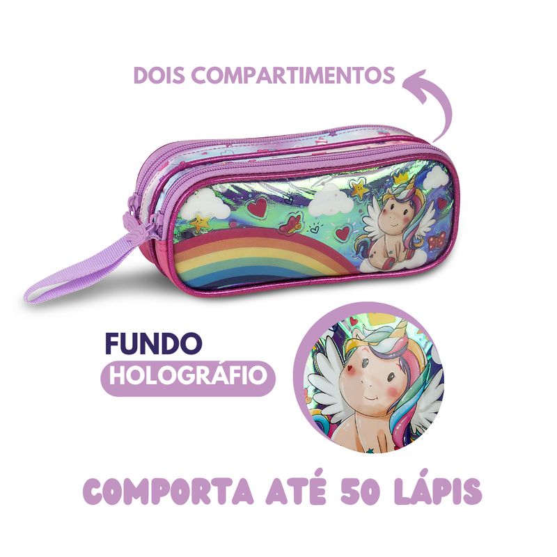 Este estojo duplo de unicórnio é perfeita para adicionar um toque de magia ao dia a dia escolar. Com um design deslumbrante e estampa holográfica de unicórnio, ele promete ser o companheiro ideal para pequenos aventureiros. O material de Poliéster, combinado com o PVC do painel frontal, não só dá um toque de sofisticação, mas também oferece resistência e durabilidade