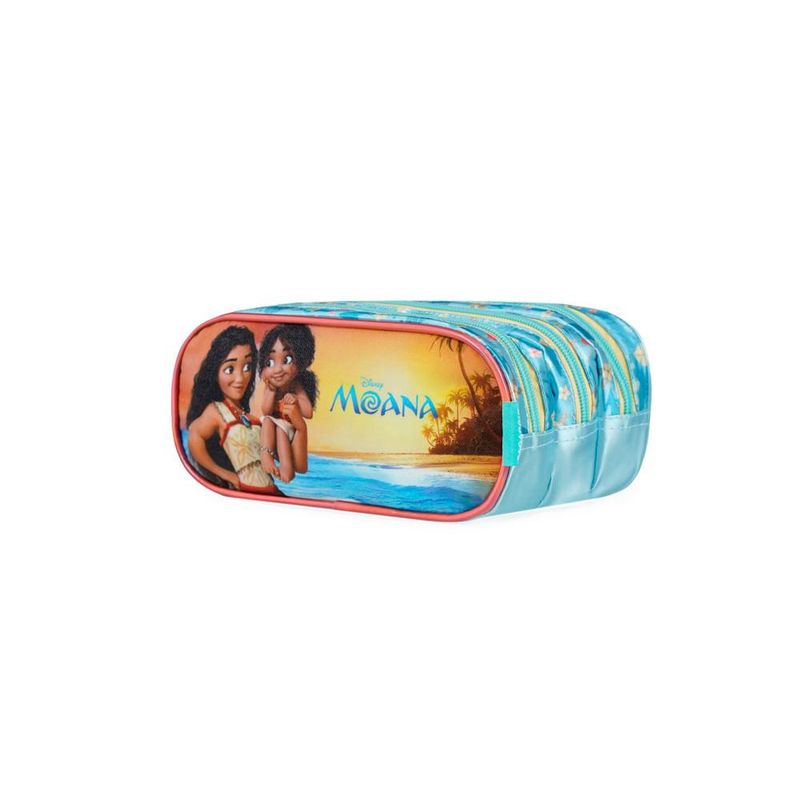 O Estojo 3 Compartimentos Moana 26P foi criado para quem busca organização real no dia a dia escolar, com um visual que combina brilho, cor e personalidade. Seu grande diferencial está no painel frontal em PVC com glitter prensado, que garante brilho duradouro sem descascar, além da estampa exclusiva da Moana e dos puxadores personalizados em formato de folha, que reforçam o tema tropical da coleção.Organização e Espaço InternoPara quem precisa separar materiais, este estojo conta com 3 compartimentos independentes, perfeitos para organizar canetas, lápis, borrachas, marca-textos, tesoura e outros itens de papelaria. Cada compartimento tem abertura própria e acesso fácil, garantindo mais agilidade no uso escolar. A estrutura rígida mantém o formato mesmo cheio, evitando que os materiais amassem ou se misturem.Praticidade para a Rotina EscolarO modelo é ideal para quem gosta de tudo no lugar certo. Os zíperes resistentes, com puxadores personalizados, ajudam a abrir e fechar com facilidade. A forma alongada acomoda lápis de tamanho padrão e até itens maiores, como réguas flexíveis e marcadores de ponta grossa. É um estojo leve, fácil de transportar e que cabe tranquilamente dentro da mochila escolar, sem ocupar espaço excessivo.Design Exclusivo e Detalhes que EncantamO destaque deste estojo é o painel com glitter prensado, que mantém o brilho intacto, somado à arte frontal com Moana e elementos do cenário da ilha. A estampa corrida no restante da peça traz flores, folhas e ícones do tema, criando um conjunto visual totalmente integrado. Os puxadores em formato de folha dão o toque extra que transforma o estojo em um item colecionável dentro do mix da Bagaggio.Por Que Este Estojo se Destaca no Mix BagaggioAlém do brilho e do design premium, o grande diferencial deste modelo é a combinação de 3 compartimentos funcionais, durabilidade e visual temático forte. Ele resolve um problema real dos pais e das crianças: manter os materiais separados, acessíveis e protegidos — tudo com o charme da Moana.2. FAQCabe bastante material dentro dele?