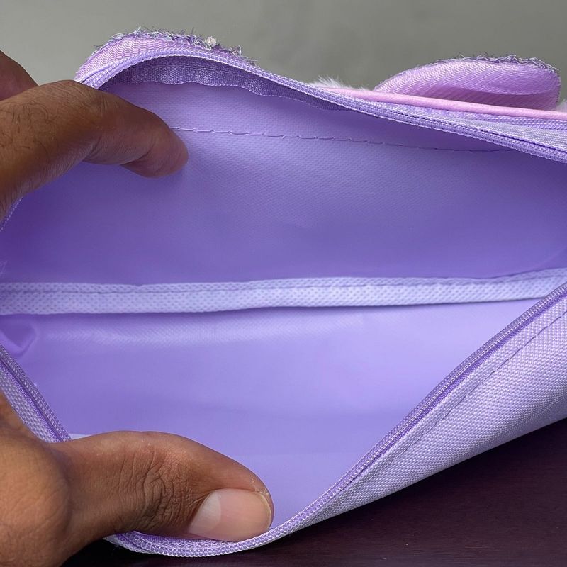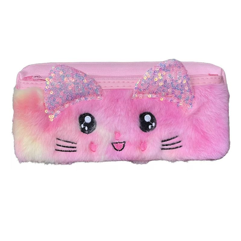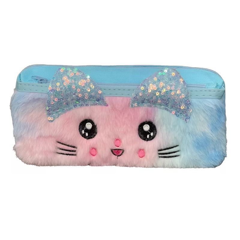 Design Adorável de Gatinho: Apresenta um design exclusivo com o rosto de um gatinho em pelúcia macia, com orelhinhas brilhantes de lantejoulas e detalhes bordados, que adicionam um toque de charme e originalidade ao estojo.