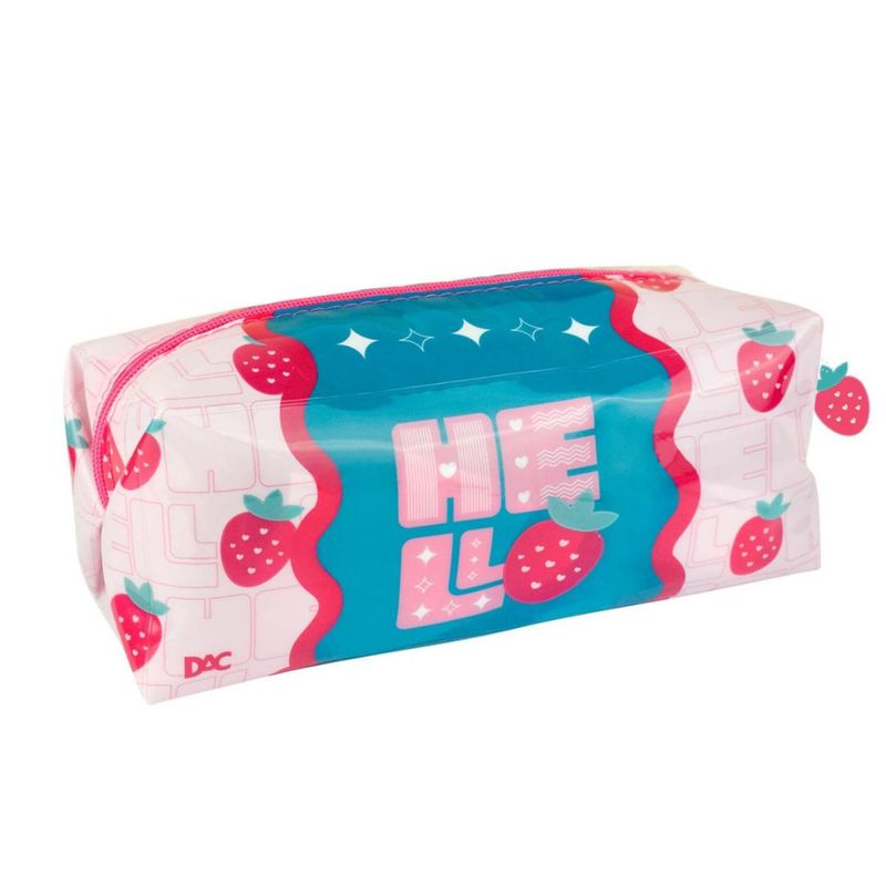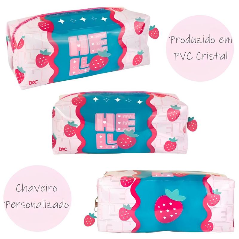 CARACTERÍSTICAS DO PRODUTO Marca: DAC Comprimento x Altura x Largura: Produto – 205mm x 80mm x 80mm Comprimento x Altura x Largura: Embalagem – 235mm x 110mm x 110mm Composição, ou Material: PVC Cristal Instrução de idade: +4 anos Peso: 90g Cor: Rosa e Verde Sku: 4485DAC Ean: 7908689910685 Detalhes: - Zíper metálico; - Pingente personalizado de morango; - Comporta aproximadamente entre 80 e 100 lápis. Instrução de uso e de lavagem Uso: Insira seus materiais no estojo. Feche o zíper após o uso. Lavagem: Limpe com um pano úmido e sabão neutro. Deixe secar ao ar livre, evitando exposição direta ao sol para não deformar o material. Resumo sobre o produto. O Estojo PVC Cristal é Ideal para quem gosta de facilitar na organização do material escolar e deixar tudo em ordem. Além do material super resistente e com fechamento em zíper, que garante maior durabilidade e proteção, ele também suporta em média 80 canetas! É ótimo para escola, mas também pode ser usado para guardar maquiagem, pincéis, produtos de higiene pessoal e dentre tantas opções.