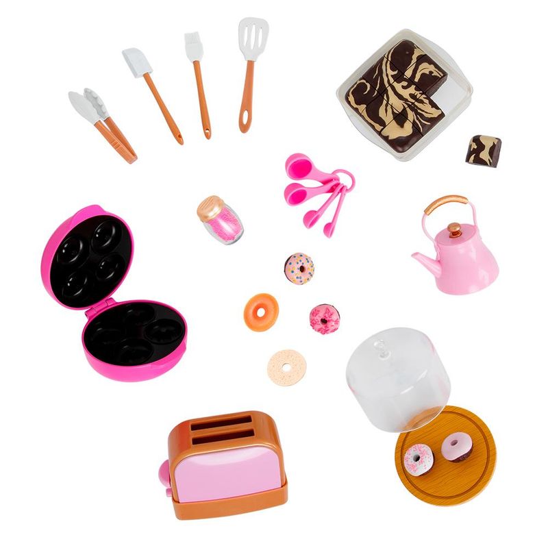Conjunto de cozinha com torradeira e chaleira para bonecas de 46cm! Preparar comidas deliciosas fica ainda mais divertido com este conjunto Our Generation! O complemento perfeito para a cozinha da sua amiguinha, cada acessório permite que suas chefs preparem a diversão mais doce. Insira as metades do bagel na torradeira e pressione a alavanca para abri-las e desfrutar de um delicioso café da manhã. Ou faça a chaleira apitar na hora do chá! Há uma celebração doce chegando? Use a espátula, as colheres medidoras, o pincel e o pote de granulado para ajudar suas bonecas a preparar uma deliciosa sobremesa. A bandeja de brownie possui uma peça removível para servir aos convidados, e a super fofa máquina de donuts faz 4 donuts coloridos que cabem perfeitamente dentro da bandeja de sobremesas! Acessórios faz de conta.